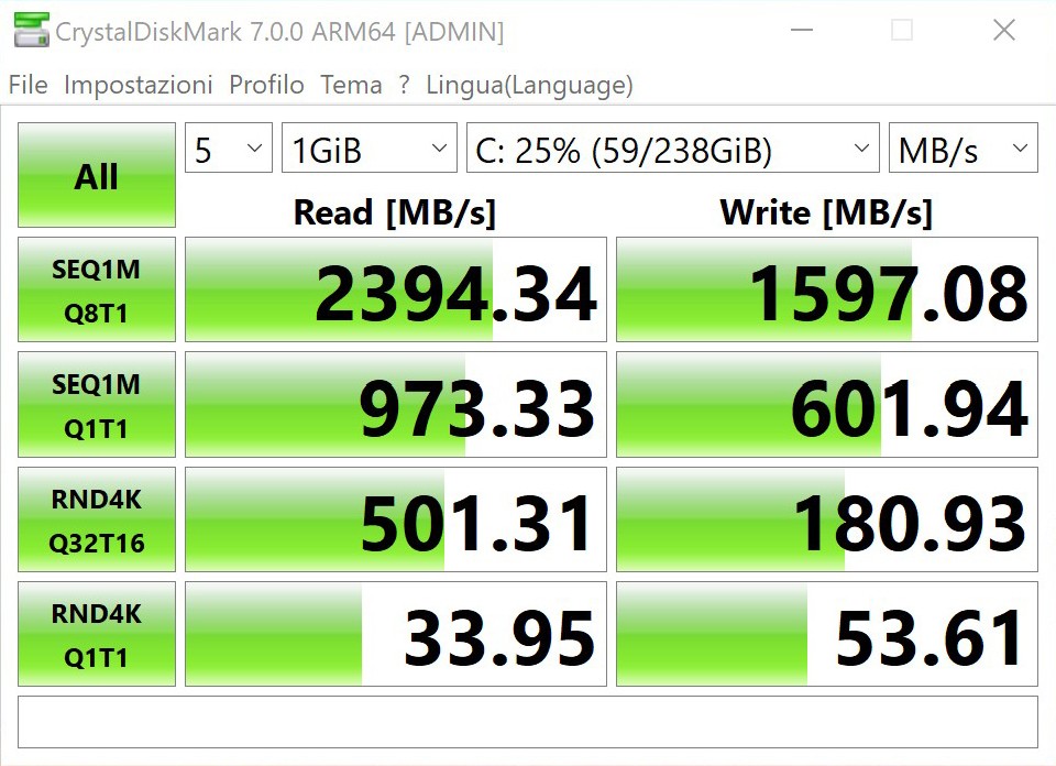 Qualcomm ha realizzato insieme a Microsoft il SoC utilizzato nel Pro X. Da questa collaborazione è nato l’SQ1, un chip con CPU octa-core e GPU integrata Adreno 685, capace di gestire 8 o 16 GB di memoria RAM e memoria d’archiviazione nei tagli da 128 o 256 GB. La buona notizia è che possono essere cambiate separatamente, c’è infatti uno slot posteriore che da accesso allo slot dove trova posto una NVME di buona qualità, sia nelle velocità di lettura che in scrittura.