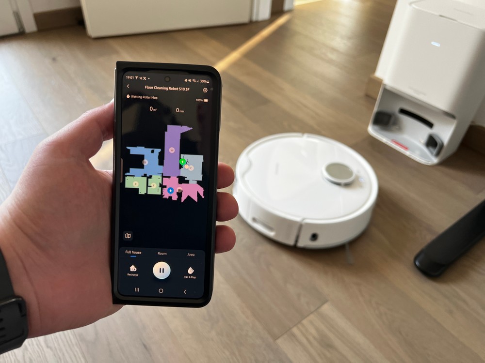 Inoltre c’è, alla fine del processo, una ulteriore fase di pulizia dedicata del rullo lavapavimenti: SwitchBot S10 si collega alla stazione dell’acqua, scarica l’acqua sporca, fa il pieno di acqua pulita (se necessario) e usa quella per un rapido e ulteriore ciclo di pulizia interna del rullo. Fatto questo scarica l’acqua sporca, fa nuovamente il pieno di acqua pulita e si avvia verso la stazione di ricarica/scarico della polvere.