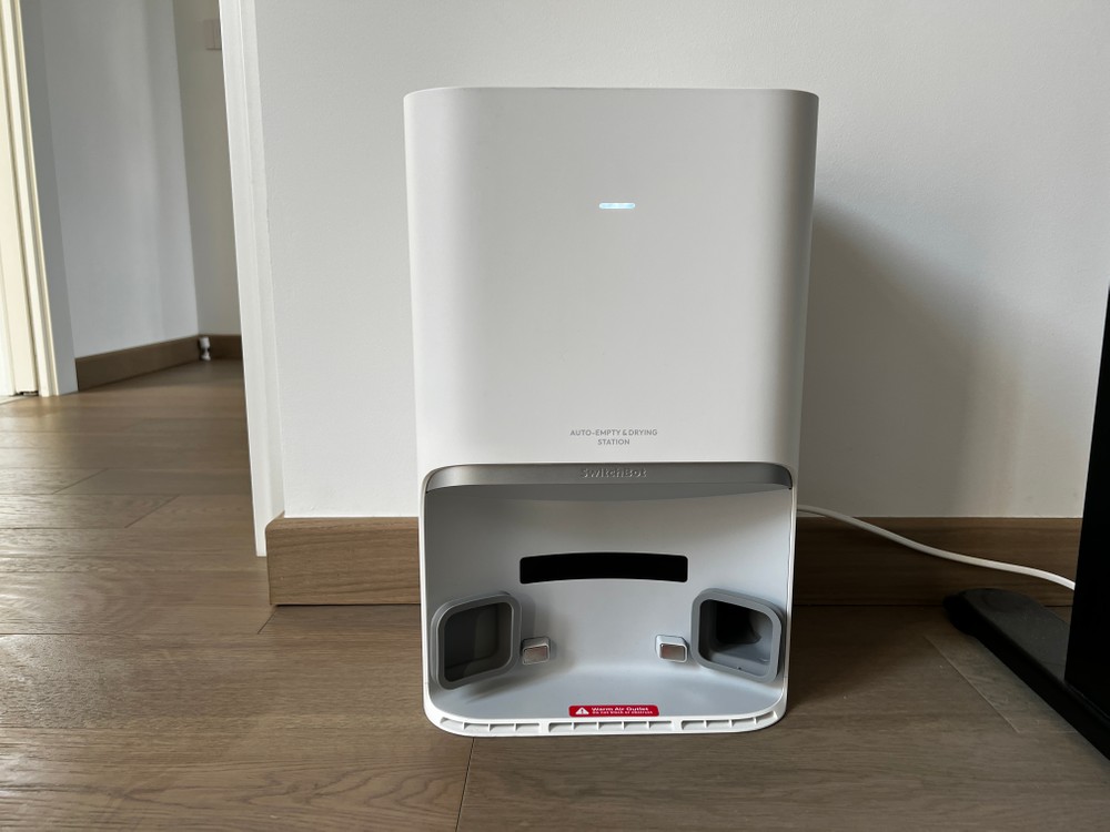 La stazione di scarico della polvere si occupa di svuotare il sacchetto della polvere interno al robot (da 4 litri) e procede poi all’asciugatura del panno ad aria calda (50° C), così da completare il ciclo di igienizzazione esattamente come gli altri concorrenti.