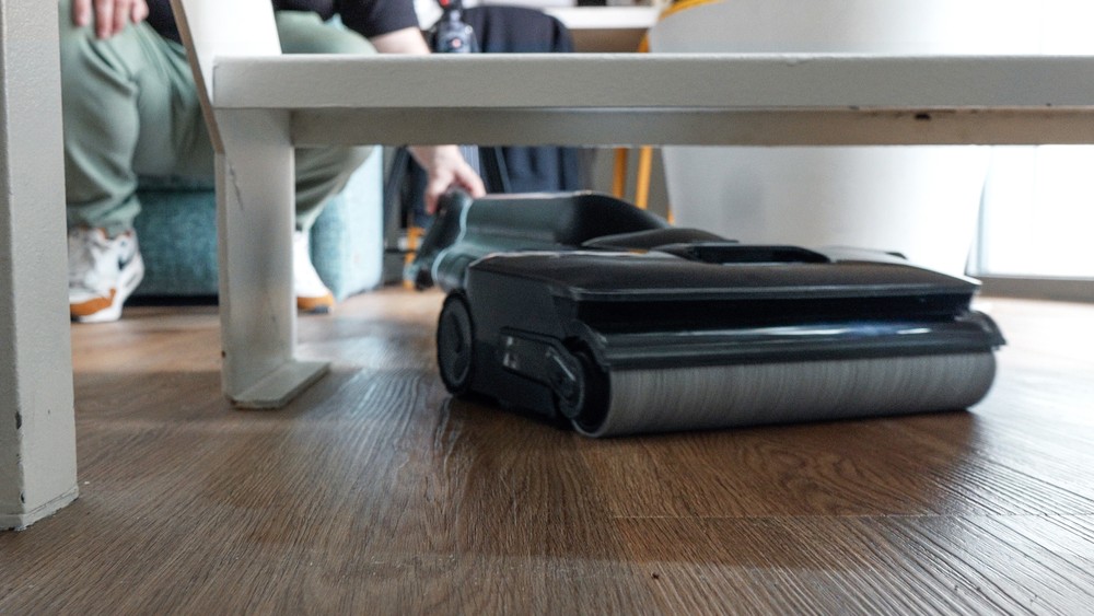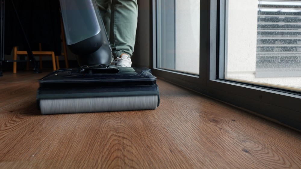 Un altro punto di forza è la qualità del lavaggio lungo i bordi e nei punti difficili da raggiungere. La testa ha una struttura simmetrica con bordi ridotti al minimo, che le permette di arrivare a pochi millimetri dai battiscopa, senza lasciare accumuli visibili. Tutto è reso possibile da un design “borderless”, privo di cornici o ostacoli laterali che di solito limitano l’estensione del rullo fino ai margini. Anche negli angoli stretti, la combinazione tra forma della spazzola e rotazione della testa (fino a 45° per lato) permette una copertura pressoché completa.