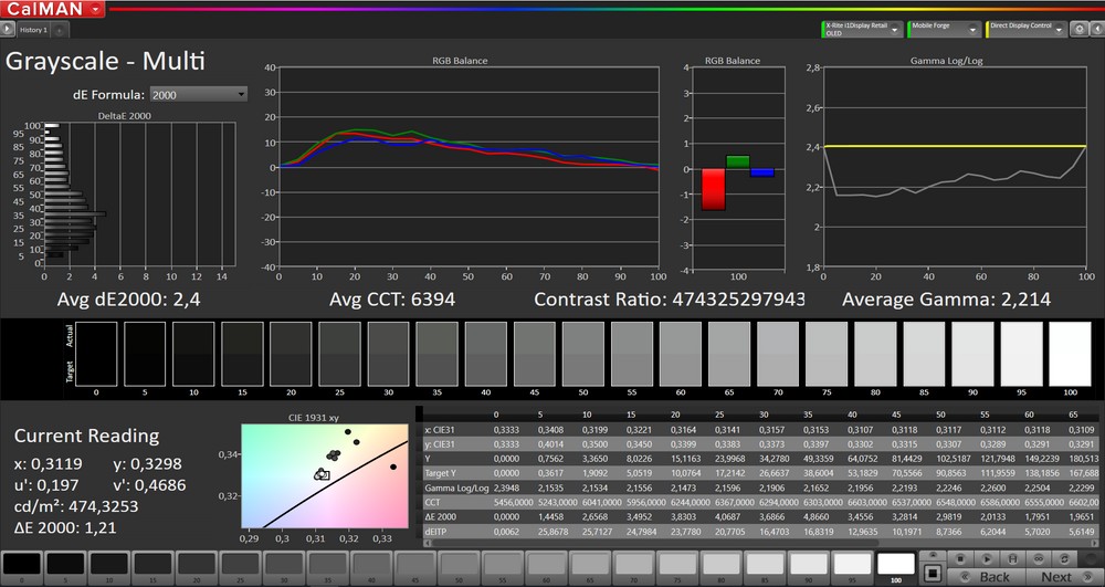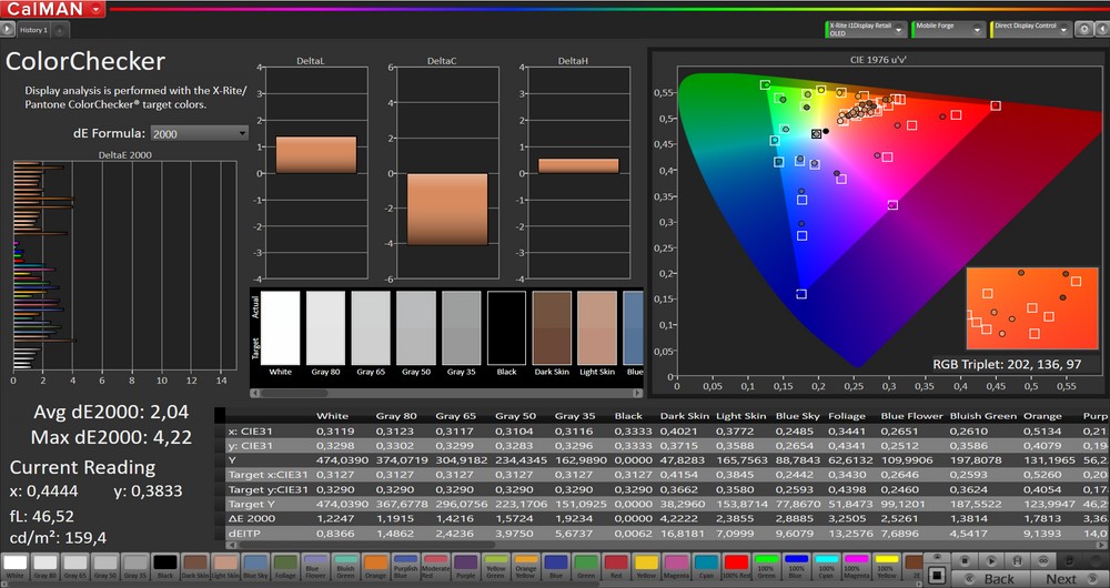 Parliamo però di un pannello molto buono anche per quanto riguarda la riproduzione dei colori. Come per la luminosità massima anche qui Xiaomi è stata un po’ generosa nelle specifiche dichiarando dei Delta E inferiori a 1. Io ho misurato con i colorimetro tutte le modalità di riproduzione dei colori disponibili nei preset, e posso dirvi che la più corretta è quella definita “Colori Originali”. In questa modalità i Delta E sono davvero bassi, i grafici qui sopra lo dimostrano. Parliamo di 2.4 per la scala di grigi e 2,04 per i colori. Siamo in tutti e due i casi ampiamente sotto la soglia della tolleranza, che è fissata a 3. Sotto a questo valore l’occhio umano, se non super allenato, non riesce a distinguere differenze rispetto alle tonalità di riferimento.