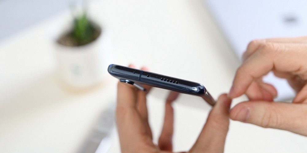 La cornice in metallo cromato e in contrasto con la cover posteriore offre uno stacco cromatico molto piacevole e ospita i tasti di accensione e spegnimento, il carrellino per la SIM, mono e senza espansione di memoria, i microfoni, il sensore a infrarossi, la USB Type C 2.0 e i due speaker di cui vi parlerò nel dettaglio più avanti.