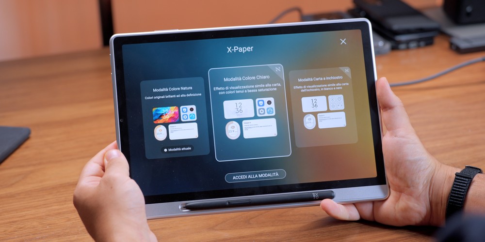 Il Magic Note Pad introduce poi un elemento distintivo: il tasto X-Paper. Con una semplice pressione è possibile cambiare modalità di visualizzazione scegliendo tra tre opzioni. La modalità standard restituisce colori vividi e saturi, ideale per contenuti multimediali e navigazione web. La modalità colore chiaro riduce la saturazione per diminuire l’affaticamento durante la lettura di documenti o testi. Infine, la modalità monocromatica simula la resa di un pannello e-ink, con un effetto molto vicino a quello dei lettori ebook.