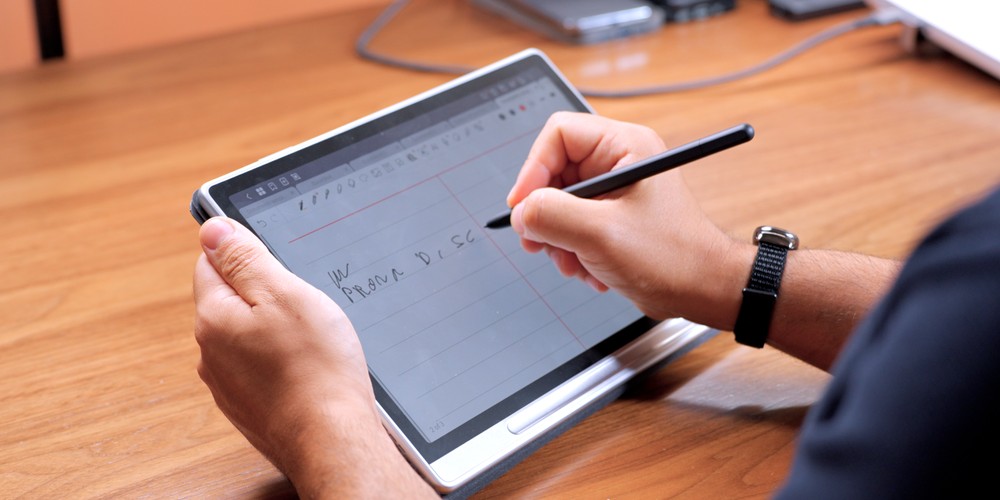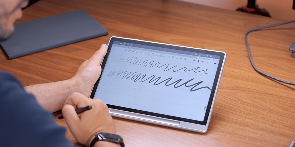 La sensazione di scrittura è particolarmente curata. La punta scorre sul display con la fluidità di una penna gel su carta di qualità, senza l’attrito ruvido di una matita ma anche senza la scivolosità eccessiva degli schermi lucidi tradizionali. È un equilibrio che rende la scrittura precisa e confortevole, evitando affaticamenti.
