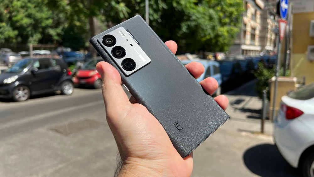 Il retro è dominato da un importante modulo fotografico in cui trovano posto i tre grandi (molto grandi) sensori da 64 megapixel, definiti “Trinity” da ZTE, un sensore ToF e un flash LED. L’isola è in metallo, ha dei bordi molto pronunciati e sporge di qualche millimetro rispetto alla scocca. Sulla parte superiore ci sono un sensore infrarossi e una griglia per lo speaker che ritroviamo anche sulla parte inferiore, accanto alla porta USB Type-C 3.1 (Gen1) e al cassettino che può ospitare due SIM Card in formato nano. Anche se il cassettino ha una guarnizione protettiva, lo smartphone non ha certificazione IP.