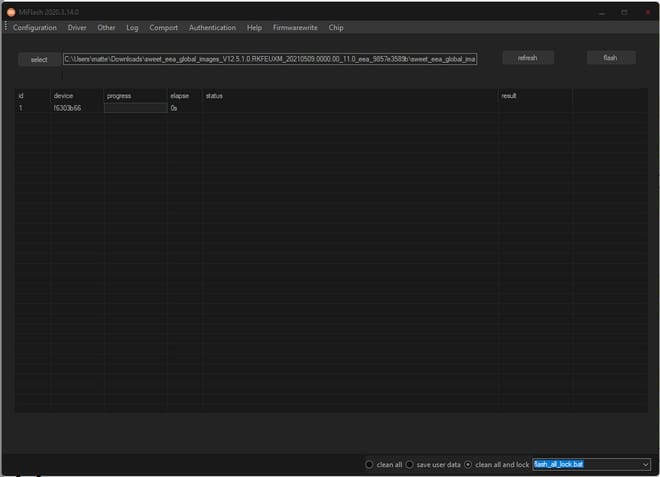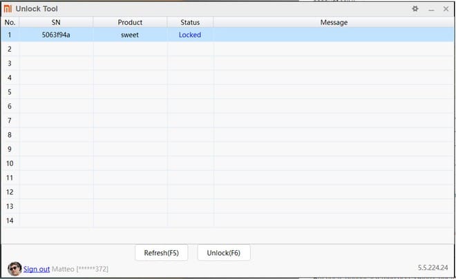 Su Mi Flash cliccate su “Refresh” per far riconoscere lo smartphone al PC, dovreste trovarvi in una situazione come nell’immagine seguente: