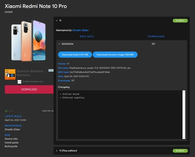 Scaricate la recovery PixelExperience da qui (LINK). Per il download cliccate prima su “stable”, poi sulla tendina dell’ultima data disponibile, poi su “Download recovery image”. Vi conviene rinominare il file in qualcosa di più semplice come “recovery” poi copiatelo all’interno della cartella “platform-tool” (quella dove avete estratto in precedenza il tool adb-fastboot).