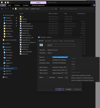 Entrate dunque in platform-tool e individuate il file “adb”, cliccate con tasto destro e poi su “proprietà”, nella finestra che si aprirà selezionate il percorso del file, poi tasto destro e copiate.
