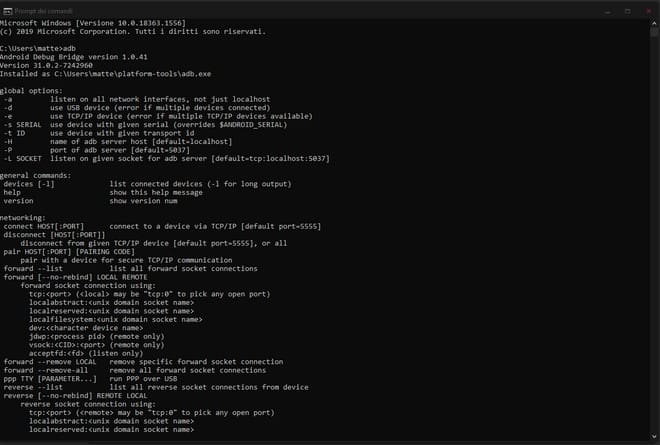 Ora verifichiamo che sia tutto in ordine. Nella ricerca di windows digitate “cmd” e aprite la finestra di comando. Qui digitate “adb” (senza virgolette). Se è tutto ok vi comparirà una lunga lista di comandi.