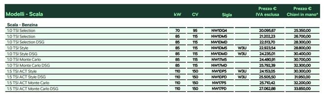 La nuova gamma di Kamiq e Scala è proposta con i propulsori 1.0 TSI e 1.5 TSI della famiglia Evo2. Il nuovo 1.0 TSI 115 CV sostituisce il precedente 110 CV ed è disponibile anche con cambio DSG a 7 rapporti, mentre sono confermati il 1.0 TSI 95 CV con cambio manuale, che rappresenta per entrambi i modelli la motorizzazione di accesso e il 1.5 TSI 150 CV con tecnologia di disattivazione selettiva dei cilindri ACT, anche con cambio DSG. L’unità 1.0 G-TEC a metano non è più disponibile.