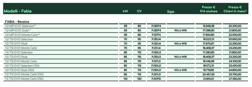 Skoda Fabia MY24 è commercializzata nelle versioni Selection, Style e Monte Carlo. La versione base offre gruppi ottici full LED, lo schermo da 8 pollici i sistemi Adas Front Assistant, Lane Assistant e Driver Activity Assistant, la connettività smartphone wireless e il sistema di accesso e avviamento senza chiave. Quanto costa in Italia? Il listino di Skoda Fabia MY24 parte da 20.200 euro.