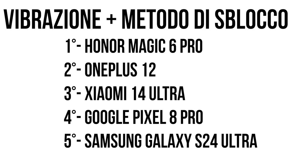 Abbiamo deciso di accorpare il voto della vibrazione e dei metodi di sblocco poiché spesso le cose vanno di pari passo. Sin da queste operazioni iniziali riusciamo a capire quanto il feedback della vibrazione sia valido ma soprattutto ben integrato. Galaxy S24 Ultra ad esempio ha un buon feedback di vibrazione ma è integrato male e poco all’interno della OneUI. Quando ad esempio sblocchiamo il nostro smartphone con l’impronta non abbiamo assolutamente alcun ritorno aptico. OnePlus e Xiaomi in questo sono da podio, poiché sia lo sblocco con l’impronta ma anche tante azioni di swipe, click e scorrimento sono coadiuvate da una risposta a livello di vibrazione eccellente.