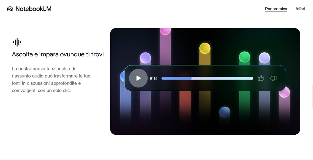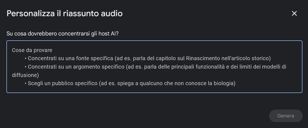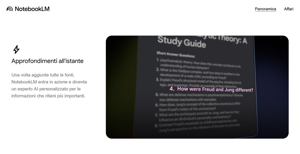 Questa è la vera genialata, oltre al recente aggiornamento che permette di tramutare i nostri documenti, video, siti web o presentazioni caricate in podcast. Sì, ora NotebookLM permette di generare anche dei podcast, con due voci dialoganti, in base a ciò che desideriamo, una vera svolta per chi sfrutta molto questo metodo comunicativo.