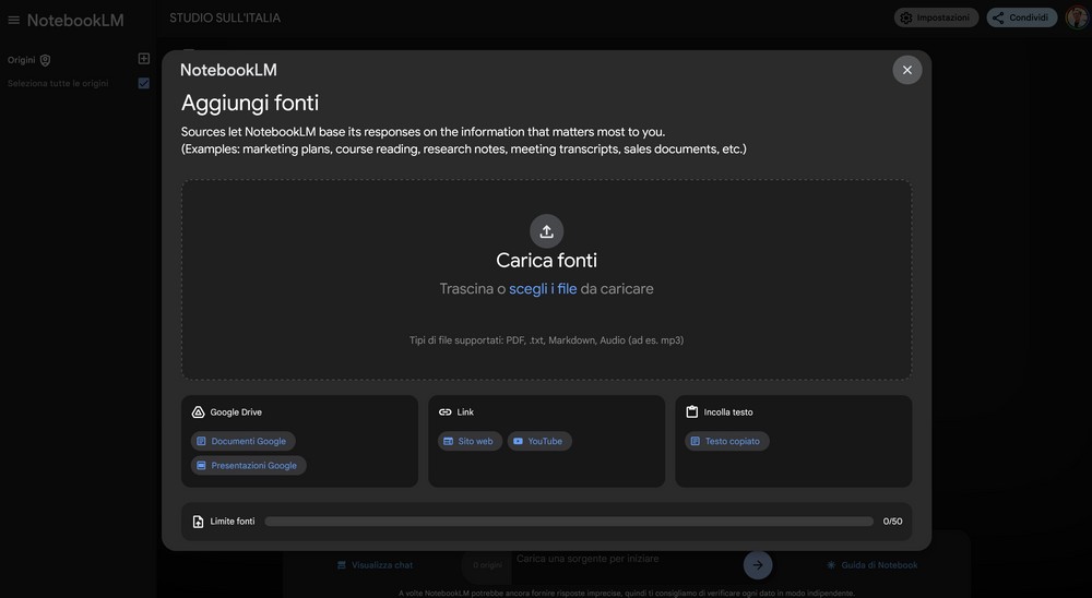 Il primo approccio è essenziale e per usare NotebookLM vi basterà sfruttare un vostro account Google per essere catapultati all’interno della homepage del nostro assistente IA. L’approccio è quello di una classica IA con chatbot: una volta creato o aperto un “notebook” esistente, un quaderno, ci troveremo di fronte alla classica stringa dove digitare del testo. Se all’interno del nostro quaderno non c’è ancora nessun materiale caricato dovremo prima caricare dei doc/pdf, un link di un sito web o di un video youtube o delle presentazioni powerpoint.