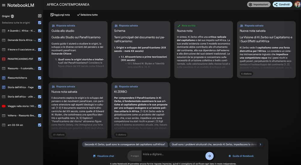 Come detto poco prima le note si generano dalle chat con l’IA, ma nessuno ci nega di scriverle anche a mano. Alla sinistra del nostro box di scrittura sono riportare le origini in uso. A sinistra infatti possiamo spuntare quale fonti utilizzare per sviluppare la nota, mentre sopra alla chat notiamo come ci sono delle domande suggerite dall’IA.