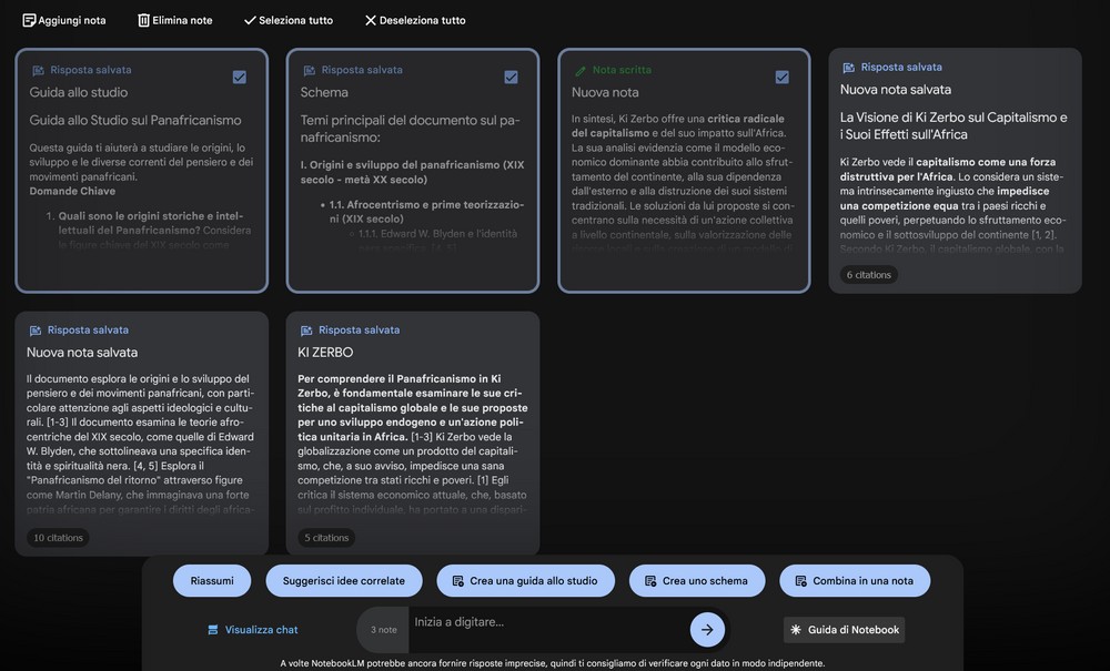 E se aggiungiamo nuovi materiali le note si aggiornano? Più o meno, basterà andarci ad interagire di nuovo per aggiornare il tutto effettuando una “Critica”. Non solo perché selezionando una o più note possiamo effettuare varie operazioni come: “Riassumi”, “Suggerisci Idee Correlate”, “Crea una Guida Allo Studio”, “Crea uno Schema” o “Combina in una Nota”. Ma come le generiamo quindi queste note, per poi andarci ad interagire?