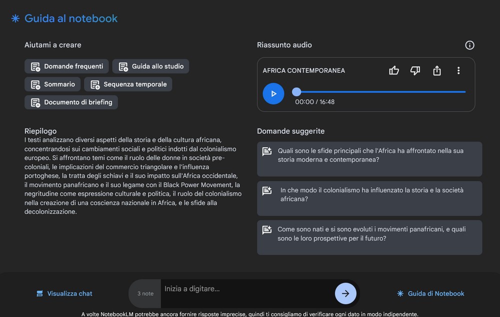 Se ci sentiamo un po’ persi durante il nostro studio c’è poi il comodo pulsante “Guida di Notebook” dove potremo avere degli aiuti su come proseguire il nostro studio, ad esempio creando una lista di “Domande Frequenti” o “Creare una Sequenza Temporale”, avremo un riepilogo brevissimo delle fonti selezionate, delle domande suggerite ed infine avremo la possibilità di creare dei Podcast.