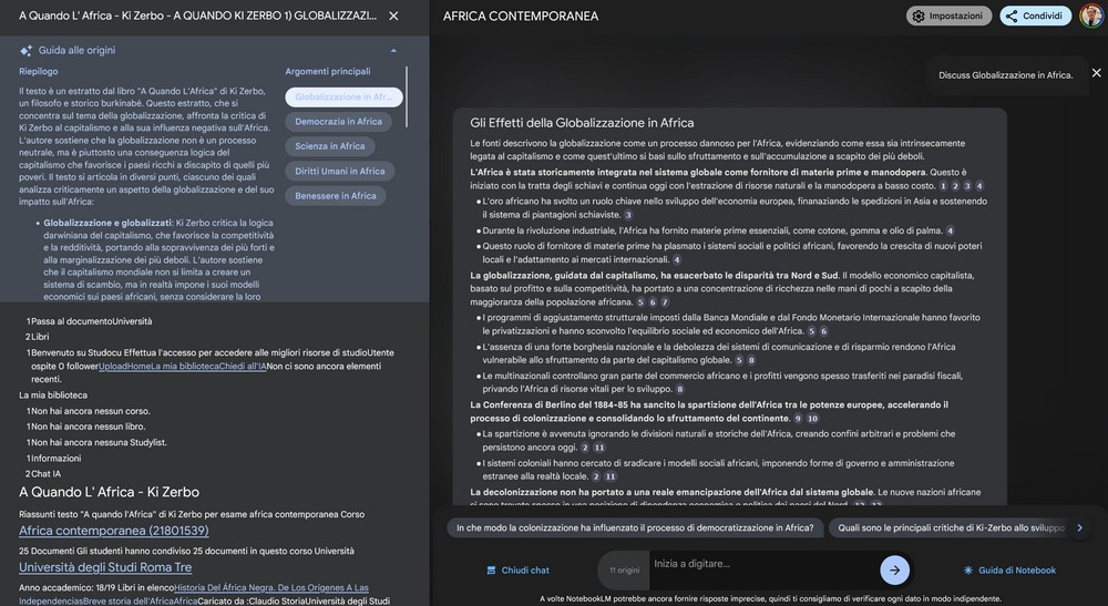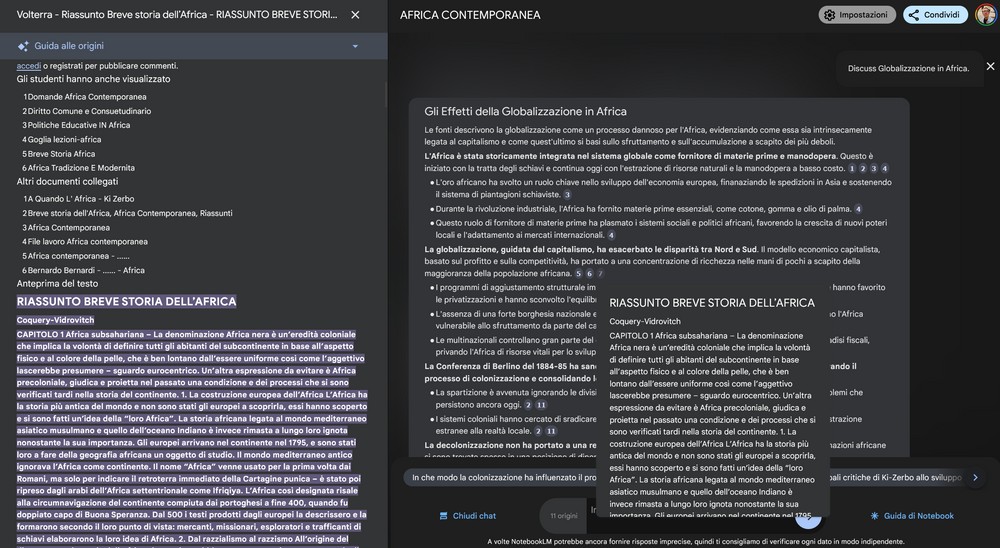 Una volta caricata una fonte come interagiamo con essa, escluso il box dedicato alla chat? Cliccando sull’Origine abbiamo una “Guida alla Origini”, una sorta di riassuntone con anche gli argomenti principali in evidenza. Cliccando i vari argomenti genereremo automaticamente un comando in chat “Discuti”, così che l’IA andrà ad approfondire quel tema, specificatamente per quella fonte.