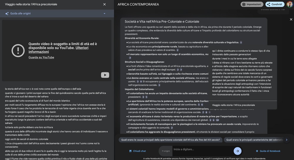 Nel caso scegliessimo un video YouTube come fonte, anziché il testo avremo una trascrizione del nostro video, ovviamente anche in Italiano. Come per i PDF o DOC avremo un riassunto e gli argomenti chiave da discutere. Nel caso di libri con immagini o presentazioni con immagini potremmo avere risposte con anche la presenza di immagini, una novità delle ultime versioni di NotebookLM.