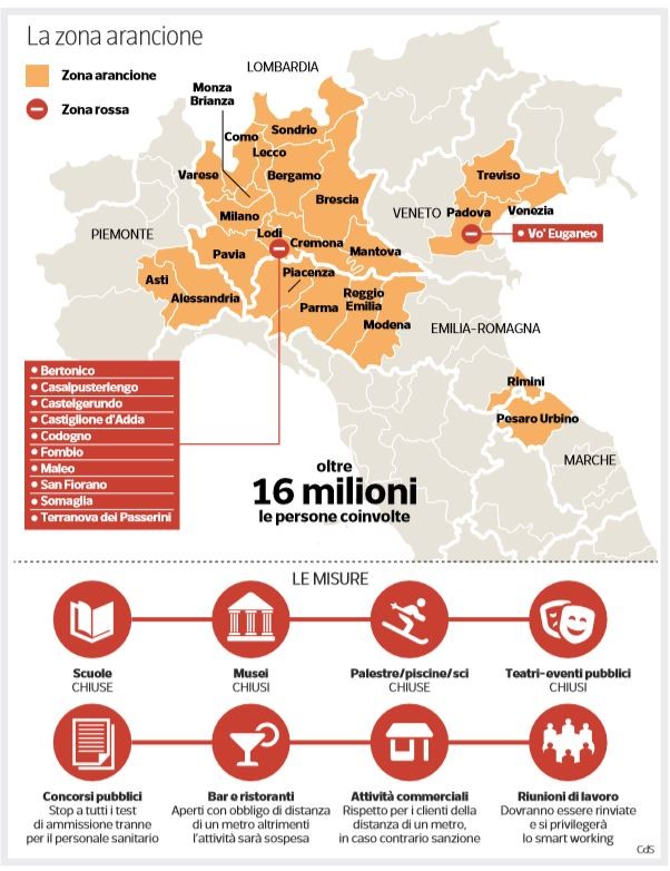 - LA ZONA IN EMERGENZA: tutta la regione Lombardia e le province di Parma, Piacenza, Rimini, Reggio Emilia, Modena, Pesaro e Urbino, Venezia, Padova, Treviso, Alessandria, Verbano-Cusio-Ossola, Novara, Vercelli e Asti