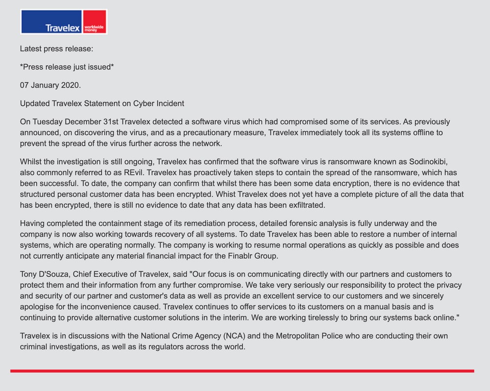 Nello specifico si tratterebbe di un ransomware denominato Sodinokibi (o REvil), tramite il quale gli hacker hanno già chiesto un riscatto di 6 milioni di dollari, ben superiore rispetto ai 600 mila dollari pagati da Riviera Beach, la cittadina della Florida che la scorsa estate ha ceduto al ricatto per “riavere” i suoi dati. In una nota diffusa sul sito ufficiale (è la sola pagina al momento raggiungibile), Travelex ha annunciato che per ora non risulterebbero casi conclamati di compromissione dei dati dei clienti, affermando però che sono necessarie ulteriori indagini per capire la dimensione (e la forza) dell’attacco subìto.