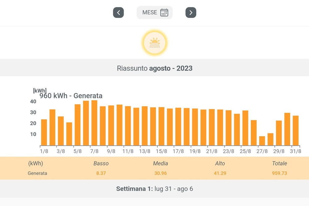 A sinistra, non avendo il raffronto con giugno 2023 poiché l’impianto è stato attivato a metà luglio dell’anno scorso, trovate la produzione dei pannelli fotovoltaici di agosto 2023. A destra, invece, i dati di giugno 2024.