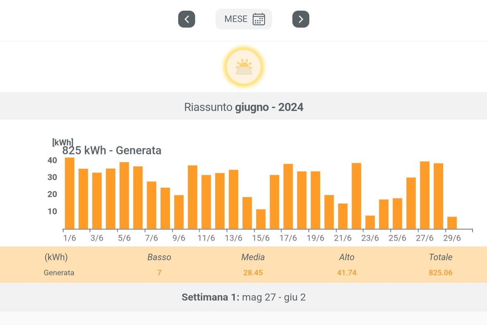 Come si evince dai numeri, e se consideriamo anche le giornate del 29 e 30 giugno non presenti nello screenshot ma con una discreta produzione, il risultato finale è stato ottimo e vicino al massimo storico del mio impianto… almeno per il momento. Gli 825 kWh generati equivalgono a più di 13 ricariche complete di una BYD Atto 3 con la sua batteria da 60,48 kWh.