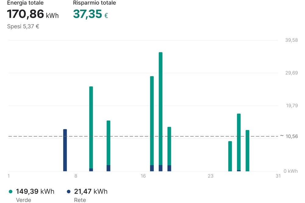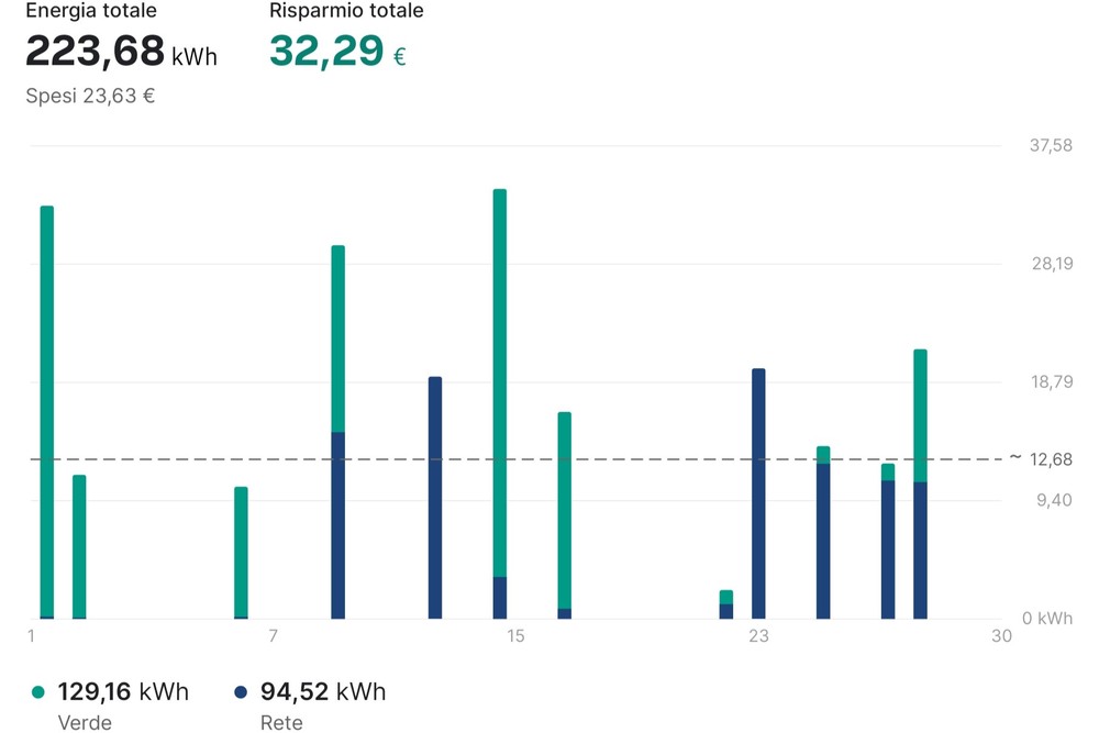 - 223 kWh ricaricati a casa, di cui 94 kWh da rete elettrica e 129 kWh da fotovoltaico
