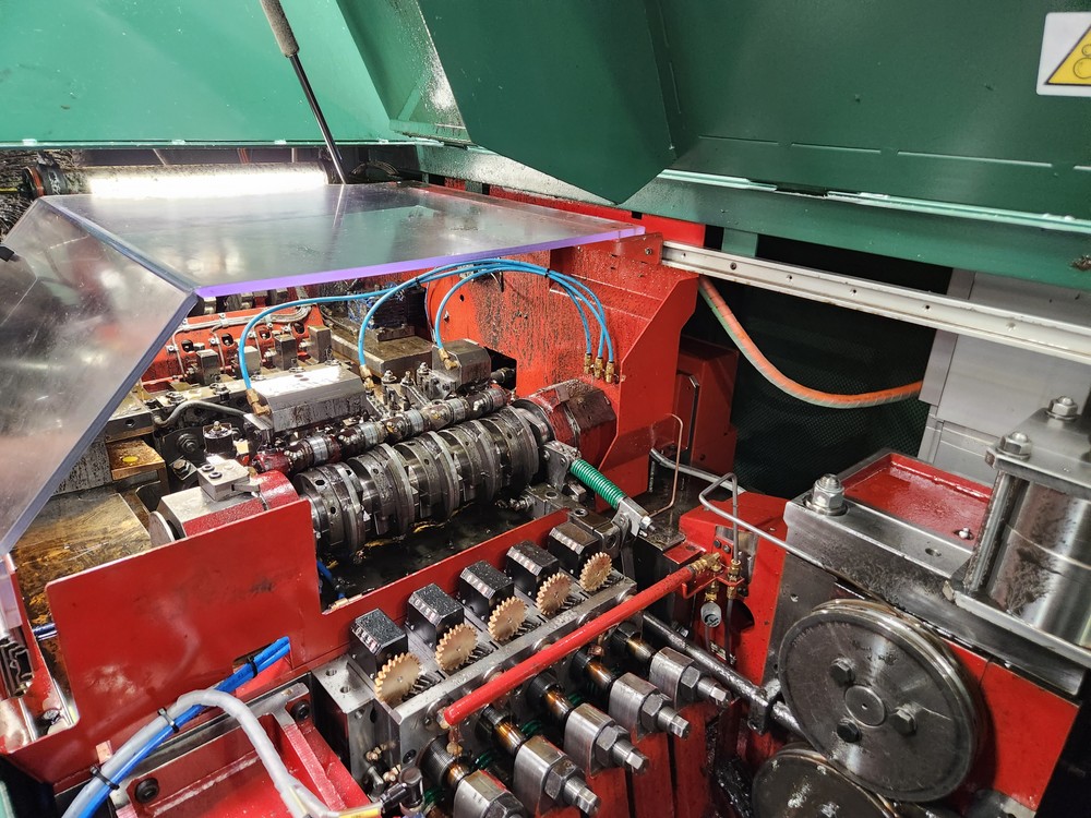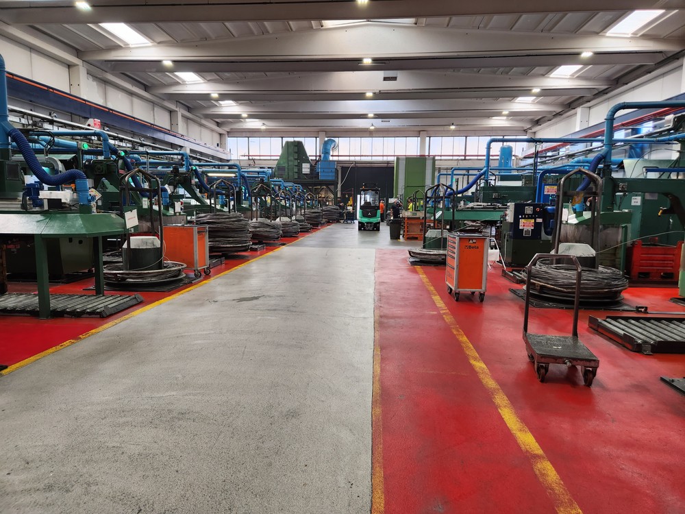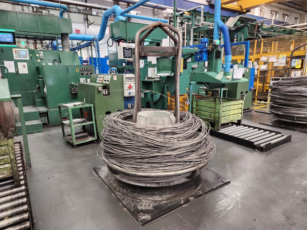 L’acciaio utilizzato arriva dall’Italia, è raccolto in grandi bobine e il filo entra automaticamente nella macchina che si occuperà di tagliarne esattamente la quantità necessaria per produrre il pezzo.