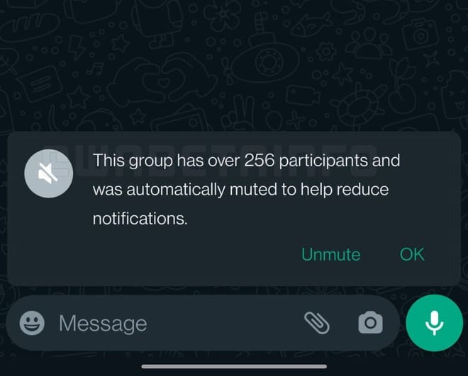 Lo screenshot condiviso da WABetainfo è piuttosto chiaro e a partire da questa beta WhatsApp su Android, un messaggio di notifica sarà recapitato in tutti i casi in cui l’utente aderisce a un gruppo con oltre 256 utenti al suo interno. Si tratta di un avviso di silenziamento automatico.